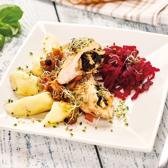 1. Posiekaj drobno śliwki, czosnek i cebulę. Jałowiec, pieprz i liście laurowe rozetrzyj w moździerzu. Wymieszaj składniki i dopraw je solą. W piersiach natnij kieszonki i włóż do nich farsz. Zamknij kieszonki wykałaczkami lub sznurkiem spożywczym. Do pozostałego farszu dodaj sos sojowy, miód i ocet balsamiczny, a następnie zalej piersi i odstaw na minimum 30 minut do lodówki.