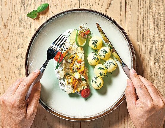 4. Ziemniaki umyj i obierz. Ugotuj w osolonej wodzie. Zrób na talerzu kleks z sosu tatarskiego, ułóż na nim filet z miruny, z pieczonymi warzywami, a obok ziemniaki posypane koperkiem. Smacznego!