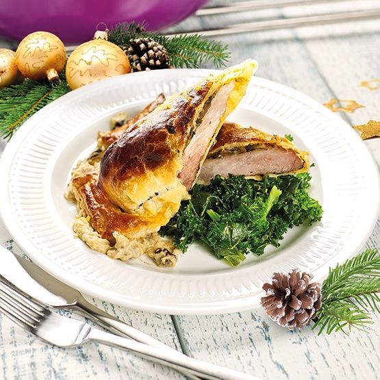 5. Do uzyskania odpowiedniej konsystencji sosu użyj wywaru z grzybów. Ugotuj jarmuż w wodzie z solą i cukrem, a następnie przesmaż go na maśle, dodaj wyciśnięty sok z grejpfruta, dopraw solą, pieprzem, oliwą z oliwek i oregano. Na talerz nałóż sos grzybowy, połóz szynkę w cieście oraz jarmuż. Smacznego!