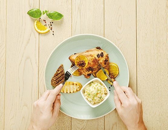 4. Całość posyp rodzynkami i posiekanymi orzechami oraz polej curry wymieszanym z sosem sojowym. Naczynie żaroodporne wstaw do piekarnika rozgrzanego do 190 oC na 50 minut. Upieczone ćwiartki podawaj na talerzu obok ulubionego pieczywa, a surówkę w osobnym naczyniu. Smacznego!
