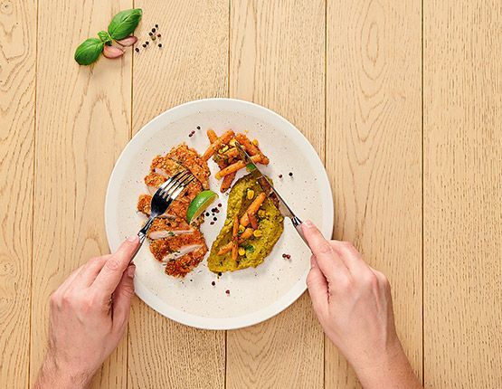 3. Jajko rozbij w misce i wymieszaj z mlekiem. Mięso najpierw obtocz w pozostałej mące pszennej, zanurz w jajku z mlekiem, a następnie obtocz w panierce z płatków kukurydzianych lub owsianych. Podsmaż na dobrze rozgrzanym oleju z obu stron na złoty kolor, a następnie przełóż do piekarnika rozgrzanego do 170°C na około 20 minut.