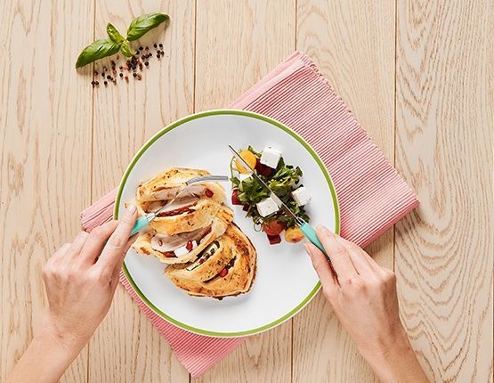 3. Na posmarowany kawałek ciasta ułóż kotlet z indyka, ok. 1 cm plastra sera typu feta, kilka kawałków suszonego pomidora oraz kilka liści bazylii. Drugi kawałek ciasta natnij w poprzek w równych odstępach, nie przecinając brzegów ciasta. Połóż go na cieście z indykiem i dociśnij brzegi. Jeśli na brzegach został nadmiar ciasta, odetnij je. Wierzch posmaruj masą mleczno-jajeczną. Ułóż w blasze na pergaminie posypanym mąką. Wstaw do piekarnika rozgrzanego do 200°C i piecz około 15 minut.