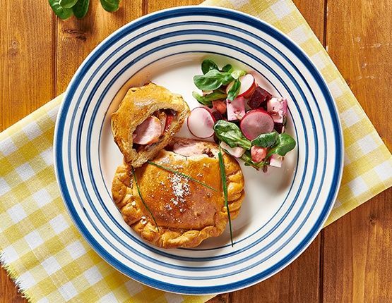 4. Roszponkę umyj i osusz. Rzodkiewki umyj, pokrój w plasterki. Buraka i ser pokrój w kostkę. Wymieszaj razem z pestkami. Sos przygotuj wg przepisu na opakowaniu. Bezpośrednio przed podaniem polej sałatkę sosem i posyp grzankami lub groszkiem ptysiowym. Pizzę calzone podawaj na talerzu, obok ułóż sałatkę. Smacznego!