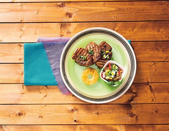 4. Kotlety piecz na rozgrzanym grillu ok. 15-20 minut z każdej strony, co jakiś czas smarując marynatą. Plastry ananasa grilluj po 2 minuty z każdej strony. Kotlety podawaj ułożone na plastrach ananasa. Obok połóż sałatkę. Smacznego