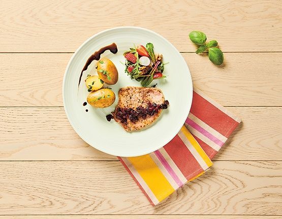 4. Młode ziemniaki dokładnie umyj (nie obieraj), a następnie ugotuj w osolonej wodzie. Po ugotowaniu podsmaż w całości na 1 łyżce masła z dodatkiem świeżego tymianku i przyprawy do ziemniaków. Liście buraka, rukolę, rzodkiewkę i truskawki umyj. Liście buraka posiekaj, rzodkiewkę pokrój na cienkie pasterki, truskawki na ćwiartki. Wszystko razem delikatnie wymieszaj. Orzechy upraż na patelni z dodatkiem miodu i ostudź. Dodaj do sałatki. Całość skrop oliwą i octem balsamicznym.