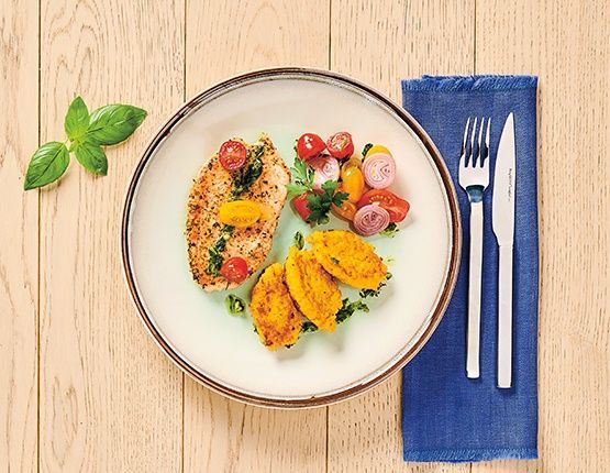4. Mięso usmaż w papirusie wg przepisu na opakowaniu. Kotlety podawaj od razu po usmażeniu, ułożone obok kotlecików z kaszy, polanych pietruszkowym pesto, oraz surówki z pomidorów. Smacznego!