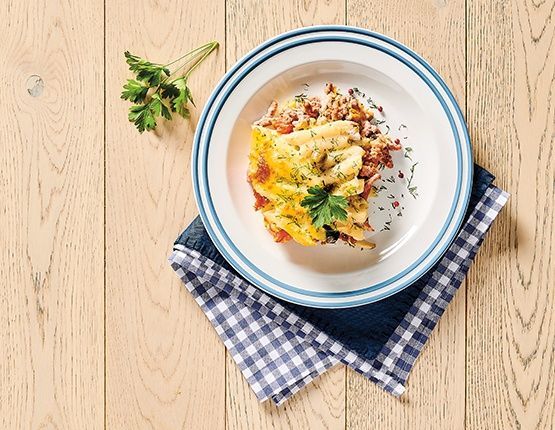 4. Mleko, jajka i śmietankę wymieszaj. Dopraw solą i pieprzem. Do żaroodpornego naczynia włóż połowę makaronu, następnie połowę mięsa z warzywami. Zalej połową zalewy z mleka, jajek i śmietany i posyp połową startego sera. Następnie ułóż tak samo kolejną warstwę. Wstaw do piekarnika rozgrzanego do 170°C i piecz około 10 minut. Zapiekankę pokrój na kwadraty. Podawaj od razu po przygotowaniu. Smacznego!