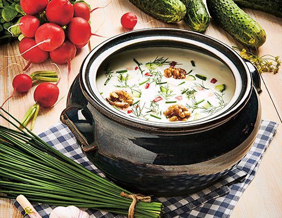 4. Chłodnik udekoruj prażonymi orzechami, szczypiorkiem i odrobiną oliwy.