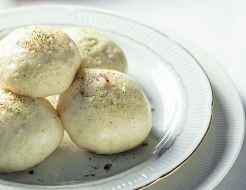 3. Potem nałożyć na nie farsz z kapusty i grzybów, zawinąć. W dłoniach uformować kule. Gotować je na parze 12 minut.
