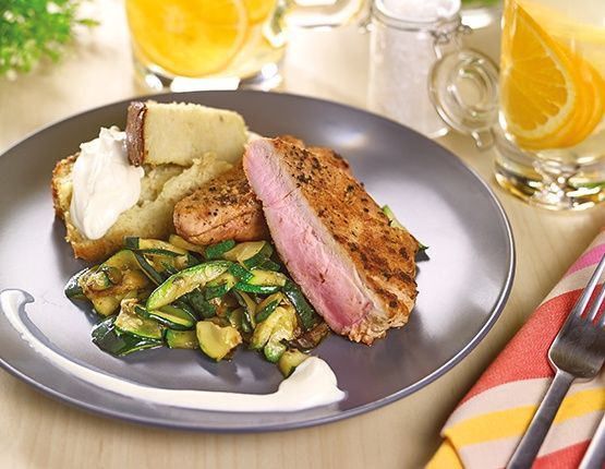 4. Cukinię pokroić w półksiężyce i usmażyć na maśle do miękkości. Babkę ziemniaczaną pokroić w duże kawałki i polać ją śmietaną, obok położyć zgrillowaną karkówkę oraz cukinią.