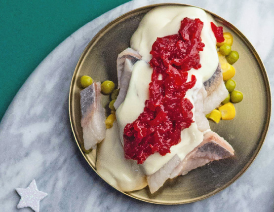 2. W naczyniu ułożyć pokrojone ziemniaki. Na nich poukładać śledzia. Następnie dodać groszek i kukurydzę.