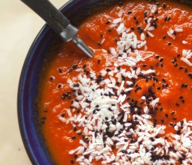 1. Ryż zalej wodą, dodaj szczyptę soli i gotuj pod przykryciem, aż ryż wchłonine całą wodę. Cebulę pokrój w kostkę, marchewkę na plasterki, a papryczkę chili i czosnek posiekaj. W garnku rozgrzej olej. Wrzuć pokrojone warzywa i duś na małym ogniu przez 5-8 minut. Pomidory sparz, obierz, oczyść z szypułek i pokrój na ćwiartki, a potem wrzuć do garnka z warzywami, dodaj cukier i szczyptę soli i duś pod przykryciem około 15 minut. Kiedy warzywa będą miękkie, wlej bulion i 100 mililitrów mleka kokosowego i zmiksuj blenderem ręcznym na gładki krem. Dopraw solą i pieprzem. Podawaj z łyżeczką mleka kokosowego, łyżką ryżu i natką pietruszki lub kolendry. :)