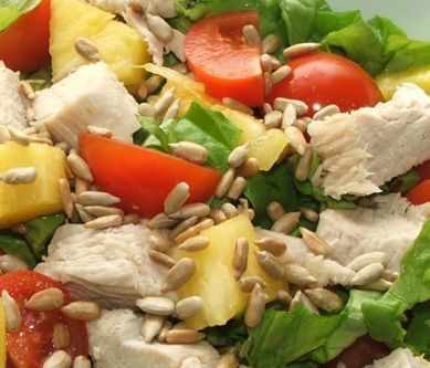 1. Pierś z indyka ugotować w warzywnym wywarze. Ostudzić. Pokroić w kostkę. Sałatę porwać na kawałki, dodać pokrojone w ćwiartki pomidorki i w większą kostkę ananasa, doprawić troszeczkę solą. Posypać prażonym słonecznikiem. Ananas jest tak soczysty, że nie potrzeba dodatkowego sosu.