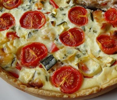 1. 1.Ciasto:z mąki,masła,jajka,żółtka,gałki muszkatołowej i szczypty soli zagnieć ciasto. Zawinąć w folię i schłodzić przez godzinę w lodówce. 2.Po wyjęciu z lodówki rozwałkować ciasto, podsypując mąką. Ułożyć je w okrągłej formie ( średnica 24cm.) Dno ciasta ponakłuwać widelcem i wstawić do nagrzanego do 175 st.C piekarnika, podpiekać 15 minut. Pozostawić w formie do wystygnięcia. 3.Nadzienie: pierś z kurczaka pokroić w kostkę oprószyć solą i pieprzem, podsmażyć na oleju. Paprykę oczyścić pokroić w kostkę.Z cukinii wydrążyć miąższ i pokroić w kostkę. Por pokroić w plasterki.Pomidorki przekroić na pół. 4.Sos jajeczno- serowy: Mleko,serek roztrzepać z 3 jajkami, doprawić solą, pieprzem,papryką. Na koniec dodać,szczypiorek starty ser i wymieszać 5. Na spodzie ciasta rozłożyć warzywa, pierś z kurczak, zalać sosem. 6. Na wierzch lekko wcisnąć odwrócone do góry pomidorki. 7. Piec w nagrzanym do 175 st.C piekarniku i przez około 50 minut.