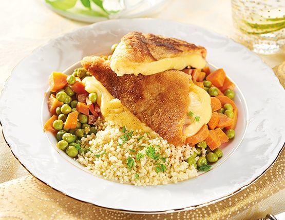 4. Obierz marchewki i pokrój w drobną kostkę. Wrzuć do garnka z połową kostki masła i na wolnym ogniu duś pod przykryciem, dolewając co kilka minut odrobinę wody. Do miękkiej marchewki dodaj odcedzony groszek z puszki i zdejmij z ognia. Dopraw do smaku solą i odrobiną cukru. Ser podawaj z kaszą kuskus i marchewką z groszkiem.