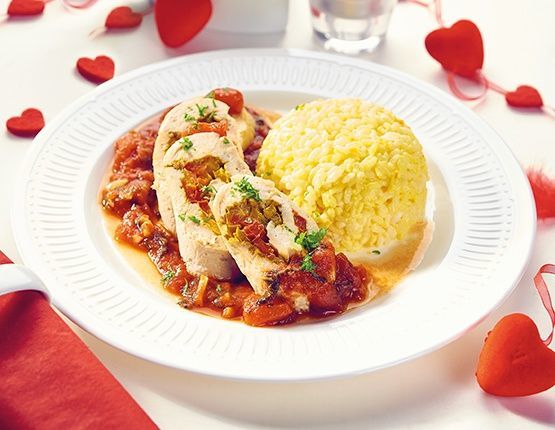 4. Do garnka wrzuć pomidory z puszki, kilka listków bazylii, przeciśnięte przez praskę ząbki czosnku. Dodaj pozostałe 50 ml śmietany, sól i pieprz do smaku. Całość duś ok. 10 minut do uzyskania konsystencji sosu. Na talerzu połóż porcję ryżu. Roladę drobiową pokrój w 2-centymetrowe kawałki i połóż na ryżu. Całość polej sosem.