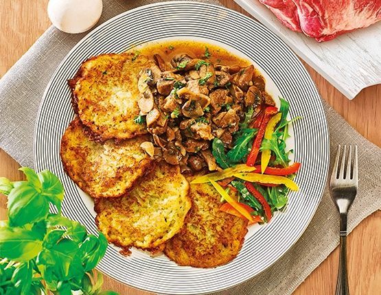 4. Na dużej patelni rozgrzej olej i nakładaj po ok. 3-4 łyżki masy ziemniaczanej. Poruszaj patelnią, aby masa równomiernie się rozłożyła. Wygładź łyżką powierzchnię placka i smaż po obu stronach na złoty kolor. Gorące placki (3-4 szt.) ułóż na talerzu, polej gulaszem i udekoruj swoimi ulubionymi dodatkami. Smacznego!