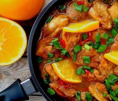 1. Filety z udźca myjemy, osuszamy, każdy kawałek kroimy na 3 części. W szklance łączymy ze sobą starty na tarce imbir, posiekaną chilli, sok z pomarańczy i sos sojowy. Na patelnie wsypujemy cukier i karmelizujemy go. Kiedy cukier się rozpuści na patelnie wkładamy kurczaka i smażymy go po 3-4 minuty z każdej strony, tak aby ładnie się zarumienił. Na patelnie wlewamy wymieszany sok pomarańczowy z przyprawami, patelnie przykrywamy i dusimy mięso 15 minut. Po tym czasie patelnie odkrywamy i odparowujemy powstały sos, aż do uzyskania pożądanej konsystencji (u mnie 5 -7 minut ). Kurczaka serwujemy posypanego szczypiorkiem i plasterkami pomarańczy z ryżem ugotowanym na sypko, smacznego.