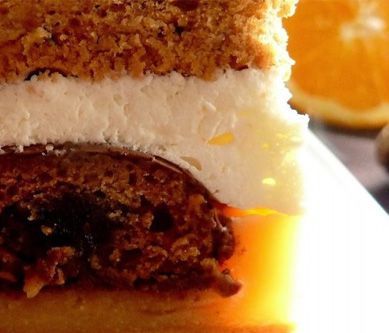 1. Ciasto: Mąkę mieszamy z sodą i przyprawą do piernika. Margarynę ucieramy z cukrem. Cały czas miksując dodajemy stopniowo żółtka. Dodajemy miód i esencję oraz wsypujemy sypkie składniki. Z białek ubijamy pianę. Delikatnie mieszamy z ciastem. Dzielimy na dwie części. Każdy placek pieczemy na blaszce wyłożonej papierem do pieczenia w 180 stopniach C ok. 25 minut.Masa pomarańczowa: Masło roztapiamy w garnuszku na wolnym ogniu. Kisiele rozprowadzamy w soku, dodajemy rozpuszczone masło. Zagotowujemy cały czas mieszając. Dodajemy galaretkę rozpuszczoną w pół szklanki gorącej wody. Mieszamy.Masa śmietanowa: Żelatynę rozpuszczamy w 1/4 szklanki gorącej wody. Śmietanę ubijamy, pod koniec ubijania dodając cukier i przestudzoną żelatynę.Polewa: W garnuszku podgrzewamy rozpuszczoną w 3 łyżkach wody żelatynę, kakao, cukier i margarynę (nie gotujemy!). Po przestudzenie (masa ma być lekko ciepła) dodajemy cały czas mieszając śmietanę.Przełożenie ciasta: miodowy placek, masa pomarańczowa, pierniki, masa śmietanowa, miodowy placek, polewa. Ciasto schłodzić w lodówce. Placki od razu są miękkie więc, nie trzeba czekać kilku dni na konsumpcję.