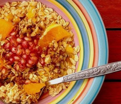 1. Płatki owsiane przesypujemy na miseczkę, zalewamy je świeżo wyciśniętym sokiem z pomarańczy i odstawiamy na 15 minut. W międzyczasie ¼ pomarańczy pozbawiamy skóry i albedo i kroimy w kostkę. Z granata wyjmujemy pestki. Orzechy siekamy. Kiedy płatki owsiane wchłoną część soku dodajemy do nich pokrojoną pomarańczę, pestki granata i całość posypujemy posiekanymi orzechami – jemy od razu, smacznego ; )