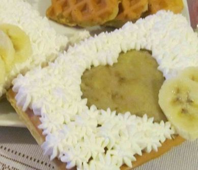 1. Dżem bananowy Wodę, cukier i sok z cytryny zagotować. Wrzucić pokrojone banany, wymieszać. Gotować na niewielkim ogniu, do uzyskania odpowiedniej konsystencji. Ciasto na gofry Jajka ubijamy z cukrem. Dodajemy mleko. Mąkę z proszkiem do pieczenia przesiewamy przez sitko, stopniowo dodajemy do miski. Dodać olej, sól, aromat waniliowy i wymieszać.