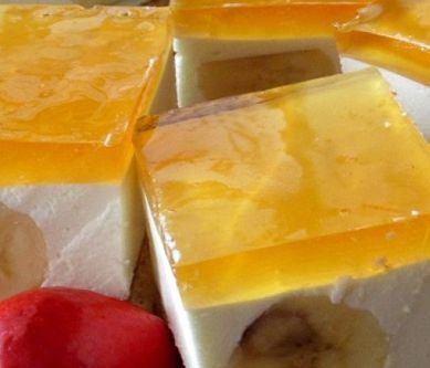1. Biszkopt Białka oddzielamy od żółtek, z białek ubijamy sztywną pianę , ciągle ucierając dodajemy żółtka i cukier a następnie dodajemy mąkę wymieszaną z proszkiem do pieczenia. Ciasto wlewamy do blaszki wyścielonej papierem do pieczenia o wymiarach 36x24 i pieczemy 25 minut w temperaturze 180C. Studzimy Masa śmietanowa Galaretkę cytrynową rozpuszczamy w szklance wrzątku i odstawiamy do stężenia. Śmietanę kremówkę ubijamy na sztywno, pod sam koniec ubijania wlewamy tężejącą galaretkę i dokładnie mieszamy. Na ciasto rozsmarowujemy cienką warstwę śmietany. Banany obieramy ze skóry układamy wzdłuż blaszki, ścinamy delikatnie i zalewamy masą śmietanową. Zalewamy dwoma tężejącymi galaretkami rozpuszczonymi w 2,5 szklankach wody. Chłodzimy w lodówce.