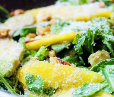 1. Obrać awokado i pokroić w paski. Przełożyć do miski. Pokropić sokiem z cytryny awokado żeby nie szczerniało. Obrać mango i pokroić w małe ćwiartki. Dołożyć do awokado. Dodajemy rukolę. Przyprawiamy solą i pieprzem. Mieszamy. Orzechy włoskie delikatnie rozgniatamy i dodajemy do sałatki. Polewamy olejem kujawskim (lub oliwą z oliwek) oraz posypujemy startym serem.