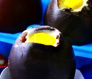 1. Czekoladę rozpuszczamy w kąpieli wodnej.zostawiamy zeby ostygła. Balony nadmuchujemy w kształcie jajka. Balony smarujemy olejem i zanurzamy do połowy w rozpuszczonej czekoladzie. Stawiamy je na papierze do pieczenia i zostawiamy do zastygnięcia. Spuszczamy powietrze z balonów i delikatnie wyjmujemy. Jajka zostawiamy w chłodnym miejscu. Krem Masło ucieramy z cukrem, dodajemy wanilię, serki i ucieramy do powstania jednolitej masy. Mango obieramy ze skórki, kroimy na kawałki i miksujemy blenderem na gładko. Jajka napełniamy kremem a na wierzch kładziemy mus z mango.