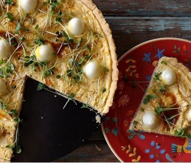 1. Ciasto Wszystkie składniki na kruche ciasto zagniatamy do uzyskania jednolitej masy. Ciasto przenosimy do formy, dokładnie wylepiamy dno i ścianki (jeśli nie mamy ceramicznej, to trzeba wysmarować masłem i podsypać mąką), nakłuwamy widelcem i wstawiamy do lodówki na ok. 1 godz.Piekarnik nastawiamy na 200°C. Schłodzone ciasto pieczemy ok. 20 min. Ciasto wyjmujemy i pozostawiamy do przestygnięcia. Rada: żeby ciasto się nie podniosło, wystarczy przykryć je papierem do pieczenia i wysypać 100 g ryżu. 5 min przed końcem ściągamy papier z ryżem. Jajka przepiórcze gotujemy max 2 min, odcedzamy, zalewamy zimną wodą i obieramy ze skorupek. Z każdego jajka odcinamy z czubka bardzo cienki plasterek, tylko tyle, żeby mogło stać. Rada: żeby łatwo obrać jajka wystarczy pojedynczo wrzucić do słoika z niewielką ilością wody i mocno wstrząsnąć kilka razy. Skorupka bardzo drobno popęka i łatwo ją ściągnąć. Masa Jajka miksujemy z dodatkiem pieprzy, papryki i lubczyku. Następnie dodajemy rozdrobniony ser, wlewamy śmietankę i ponownie miksujemy do momentu, aż masa będzie jednolita, gładka. Masę serowo-jajeczną przelewamy na przestudzone ciasto, dodajemy w dowolnej kompozycji jajka, posypujemy szczyptą pieprzu i wstawiamy do piekarnika rozgrzanego do 185°C. Wierzch przykrywamy papierem do pieczenia, żeby jajka z wierzchu się nie spiekły. Pieczemy max 20 min do suchego patyczka. Pod koniec można ściągnąć papier, żeby masa się przyrumieniła. Tarte podajemy z kiełkami rzodkiewki (moje kiełki są wyhodowane w domu- polecam). Smacznego :)