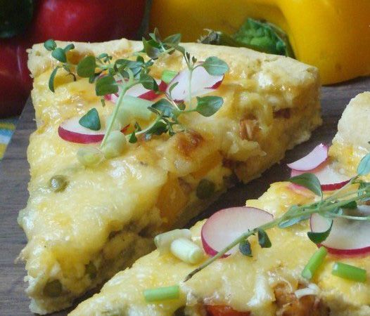 1. Margarynę pokroić w kostkę dodać do niej przesianą mąkę, sól, jajka i 3 łyżki wody, zagnieść kruche ciasto i schłodzić. Papryki i wędlinę pokroić w większą kostkę, a cebule w piórka na patelni podgrzać olej i podsmażyć na nim cebule, papryki oraz wędlinę dodać tymianek i odsączony z zalewy groszek, wymieszać i doprawić do smaku solą oraz pieprzem, wystudzić. Okrągłą formę około 25 cm średnicy wysmarować tłuszczem, schłodzone ciasto rozwałkować i wylepić nim dno i boki formy w kilku miejscach nakłuć widelcem. Do przygotowanej formy przełożyć całe nadzienie i zalać ubitymi jajkami razem ze śmietaną i szczyptą soli po wierzchu posypać startym żółtym serem. Piec w 180st około 45 minut po upieczeniu podawać gorące posypane plasterkami rzodkiewki i szczypiorkiem.