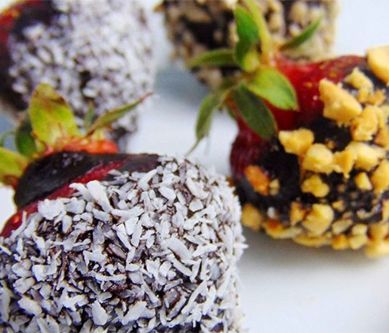 1. Truskawki dokładnie myjemy i suszymy. Olej kokosowy rozpuszczamy w garnuszku, odstawiamy z palnika, dodajemy słodzik, kakao i energicznie mieszamy.Truskawki moczymy w polewie, następnie obtaczamy w dodatkach