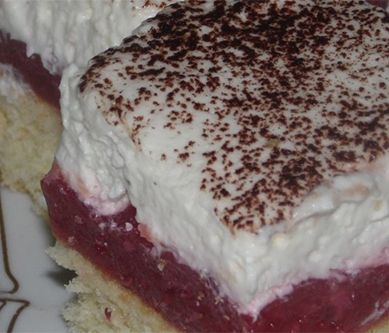 1. Upiec biszkopt: żółtka oddzielić od białek. Białka lekko ubić, po czym stopniowo dodawać cukier cały czas ubijając, gdy będzie ubite, dodawać po 1 żółtku, nadal ubijając. Kolejno przesiewać mąkę, delikatnie mieszając łyżką drewnianą. Masę wylać do blaszki o wymiarach 24x34cm, wysmarowanej margaryną (tylko spód). Piec w temp 180 st C ok 30 minSporządzić masę truskawkową: rozpuścić 2 galaretki w 1/2 litra wrzącej wody i wystudzić. Truskawki zmiksować w blenderze i połączyć z galaretkami. Wymieszać i włożyć do lodówki do momentu aż zacznie gęstnieć. Gęstą galaretkę wylać na biszkopt.Śmietanę ubić na sztywno. Dodać cukier waniliowy i śmietanę fix. Wyłożyć na masę truskawkową. Z wierzchu posypać kakaem.