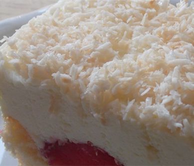 1. 1. Upiec biszkopt z 6 jaj (Wielkość blaszki do pieczenia: 24x39cm). Na upieczony, wystudzony biszkopt wyłożyć truskawki.2. Galaretki cytrynowe rozpuścić w 1/2 l wrzącej wody.3. Ser zmiksować z 2 łyżkami cukru. Do sera dodawać stopniowo tężejącą galaretkę4. Śmietanę ubić ze śnieżką. Dodać do sera, delikatnie wymieszać drewnianą łyżką.5. Kokos z cukrem uprażyć na maśle na złoty kolor.6. Masę wyłożyć na ułożone na biszkopcie truskawki.7. Wierzch ciasta posypać ostudzonym prażonym kokosem. Ciasto włożyć do lodówki.