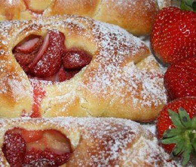 1. Drożdże, łyżka cukru i 2 łyżki mleka wymieszać i zostawić na 10 minut. Jajka ubić z resztą cukru i cukrem waniliowym. Do ciepłego mleka włożyć pokrojone masło. Do miski przesiać mąkę, dodać jajka, drożdże, mleko z masłem, szczyptę soli i wyrobić gładkie ciasto. Przykryć i zostawić do wyrośnięcia.Ciasto po wyrośnięciu podzielić na 9 części. Z każdej uformować owalny placek. Na środku położyć pokrojone w ćwiartki truskawki, boki naciąć nożem i przełożyć jeden przez drugi.Ułożyć drożdżówki na blaszce wyścielonej papierem do pieczenia, przykryć ściereczką i niech chwilę podrosną.Posmarować roztrzepanym białkiem i piec 25 min w temp 180 stopni. Po upieczeniu posypać cukrem pudrem.