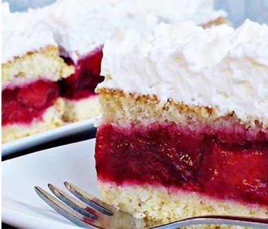 1. Biszkopt Do miski wlać białka po oddzieleniu od żółtek.Ubijać a po chwili dodać obydwa cukry i ubić pianę na sztywno.Następnie gdy cukier się rozpuści dodać żółtka, połączyć je z białkami a następnie przez sitko przesiać do miski mąki i proszek do pieczenia.Na najniższych obrotach lub za pomocą łopatki wymieszać ciasto i przełożyć je do formy o wymiarach 22 x 29 cm wyłożonej papierem do pieczenia.Blachę wstawić do nagrzanego do 170 stopni na 30 minut i upieczony biszkopt wyjąc z formy, odkleić papier i biszkopt wystudzić na kratce.Gdy będzie zimny przekroić na dwa blaty. Masa truskawkowa Truskawki wrzucić do szerokiego rondla i podusić.Większe można przekroić na połówki.Włączyć ogień pod rondlem i podgrzewać, wlać wodę i dalej podgrzewać aż truskawki się zagotują.Chwilę gotować, wyłączyć ogień i wsypać galaretki po czym dokładnie wymieszać.Masę truskawkową zostawić do wystudzenia od czasu do czasu mieszając.Gdy masa jest gęsta ale nie ścięta do końca przystąpić do przełożenia ciasta. Przełożenie Jeden blat biszkoptowy ułożyć na papierze z pieczenia włożonym do formy.Nasączyć biszkopt ulubionym płynem lub ponczem ( u mnie herbatka granulowana truskawkowa ), na biszkopt wyłożyć masę truskawkową.Rozprowadzić ją po powierzchni biszkopta, przykryć drugim plackiem, który także należy nasączyć.Zimną śmietanę ubić z cukrem na sztywno, cienką warstwą rozsmarować na cieście aby śmietana lepiej się trzymała i pozostałą śmietaną za pomocą dekoratora lu szprycy udekorować całą górę ciasta.Gotowe ciasto wstawić do lodówki aby dobrze się związało.