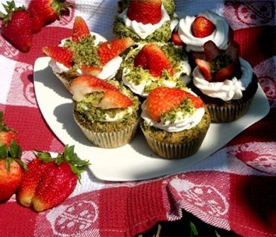 1. Szpinak rozmrażam i odciskam z nadmiaru wody.Wbijam do miski jaja, dodaję cukier i miksuję na puszystą masę. Powoli dolewam olej i nadal miksuję. Do masy - wciąż ubijając - dosypuję na zmianę obie mąki zmieszane z proszkiem do pieczenia. Na końcu dodaję szpinak i mieszam delikatnie drewnianą łyżką. Ciasto piekę w papilotkach - nakładam je łyżką do wysokości ok. 2/3 papierka. Piekę w 180 stopniach Celsjusza przez ok. 20-25 minut (do suchego patyczka).Studzę ciastka (uwaga - z wierzchu są raczej złote niż zielone, ale to... pozory). ;) W tym czasie ubijam śmietanę na sztywno, pod koniec dodając śmietan-fixy i cukier. Z ciastek odcinam wierzch, drążę środek i kruszę go na drobinki. Na pozostałą część ciasta nakładam ubitą masę śmietanową. Wierzch zdobię okruszkami, dociskam je lekko, a na nich umieszczam dowolną ilość truskawek (albo innych dostępnych akurat owoców). A później delektuję się truskawkami prosto z trawki! Mniam! :)