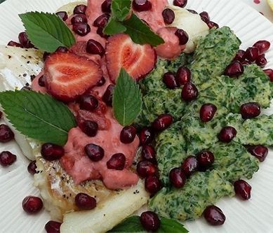 1. Filety z dorsza myjemy pod zimną wodą i osuszamy ręcznikiem papierowym. Folię aluminiową tniemy w prostokąty, każdy oprószamy solą ziołową i pieprzem cytrynowym, kładziemy po jednym kawałki fileta, ponownie oprószamy przyprawami, układamy po wiórku masła i zawijamy w szczelny pakuneczek. Tak przygotowane wstawiamy do piekarnika nagrzanego do 180 stopni na 30 minut. Salsa truskawkowa Truskawki myjemy, pozbawiamy szypułek i przekładamy na patelnię. Posypujemy cukrem (ilość wg uznania, ja dałam 2 płaskie łyżki), skrapiamy sokiem z cytryny i octem balsamicznym i chwilę przesmażamy, następnie dodajemy serek mascarpone i na małym ogniu smażymy aż się rozpuści, a sos nieco zredukuje. Kluseczki kładzione szpinakowe Jajka wbijamy do miski, rozkłócamy, dodajemy mąkę i rozmrożony, odciśnięty szpinak. Przyprawiamy czosnkiem niedźwiedzim, solą ziołową i pieprzem (najlepiej świeżo mielonym). Całość dokładnie mieszamy łyżką, aż masa stanie się jednolita - powinna być gęsta. W garnku gotujemy wodę, lekko solimy i wlewamy łyżkę oleju. We wrzątku maczamy łyżkę, następnie gorącą nabieramy małe porcje ciasta i zanurzamy w wodzie, postępujemy tak z całym ciastem. Gotujemy minutę od wypłynięcia na wierzch. Rybę polewamy sosem truskawkowym, podajemy z kluseczkami i dekorujemy ziarenkami granatu, listkami świeżej mięty oraz połówkami truskawek. Cała dekoracja jest do zjedzenia. Smacznego :)