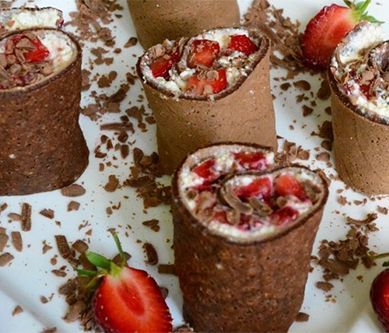 1. Ciasto Wszystkie wymienione składniki wymieszać za pomocą miksera do płynnej naleśnikowej konsystencji. Smażyć na rozgrzanej patelni. Farsz Serek wymieszać z cukrem, cukrem wanilinowym, jogurtem naturalnym, żółtkiem i cynamonem. Truskawki pokroić w drobną kostkę.Całą powierzchnię każdego naleśnika posmarować farszem a następnie ułożyć truskawki. Zwinąć w rulon i odciąć nierówne końce. Pozostałą część naleśnika pokroić w około 5cm kawałki.Naleśniki podawać ułożone pionowo na talerzu i posypane startą czekoladą.