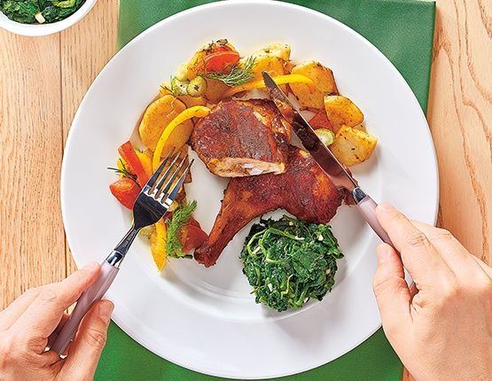 4. Szczypiorek posiekaj, wymieszaj z masłem i dodaj do kurczaka pod koniec smażenia mięsa. Udka nabiorą świeżego maślano-szczypiorkowego smaku. Ćwiartki z kurczaka ułóż na talerzu razem z ziemniakami i warzywami. Posyp szczypiorkiem. Smacznego!