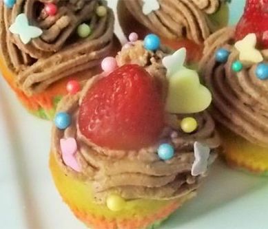 1. Do naczynia włożyć po kolei: mąkę, proszek do pieczenia i cukier, wymieszać. Do drugiego naczynia włożymy jajka, mleko i roztopioną (zimną) margarynę. Oba naczynia połączyć. Wymieszać. Ciasto podzielić na 4 części. Do każdej części dodać po trochu barwnika i wymieszać. Nakładać do papilotek po trochu każdej z mas, jedną na drugą. Czekoladę roztopić nad kąpielą wodną. Śmietanę 30% ubić, dodać cukier puder, śmietan fix, a następnie roztopioną i przestudzoną czekoladę. Na babeczki nakładać po trochu masy, ozdobić różnymi ozdobami wg uznania.