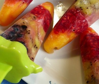 1. Cytrynę umyć, wycisnąć do dzbanka, dolać wodę, dosłodzić do smaku, dokładnie wymieszać. Brzoskwinię i kiwi pokroić w małą kostkę, maliny podzielić na mniejsze kawałki. Owoce układać w foremkach na lody kolorami, zalać lemoniadą i włożyć patyczki. Mrozić przez co najmniej 6 godzin. Smacznego!