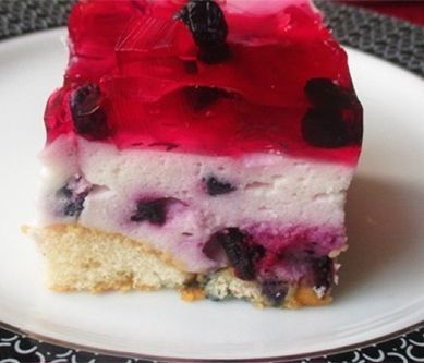 1. Dno tortownicy(średnica 24) wykładamy nasączonymi w wodzie gazowanej biszkoptami.. Do wysokiego naczynia przelewamy mleko, dodajemy sernik na zimno-miksujemy. Masę dzielimy na 2części. Do jednej dodajemy jagody, a drugą pozostawiamy bez zmian. Masy wykładamy na przemian robiąc małe zygzaki. Układamy jagody. Galaretki rozpuszczamy w 800ml wrzącej wody. Jedną Zostawiamy do lekkiego stężenia a drugą do mocnego stężenia. Gdy galaretka mocno stężeje kroimy ją w kwadraty, posypujemy górę sernika i zalewamy tężejącą galaretką. Podawać schłodzoną.