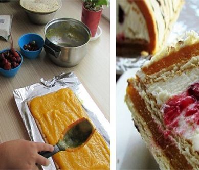 1. Z puszki brzoskwiń wylać syrop i odłożyć do dekoracji połówkę jednej brzoskwini. Pozostałe brzoskwinie przełożyć do garnka, zalać ok. 1/4 syropem z brzoskwiń i zmiksować blenderem. Wyłożyć na palnik i zagotować, dodać żelatynę, wymieszać i odstawić, aby masa się ostudziła. Na folii aluminiowej wykładamy prostokąt o wymiarach: 7 x 3 herbatniki. Następnie wykładamy na niego przygotowany mus brzoskwiniowy, rozprowadzamy i ponownie przykrywamy taką samą kombinacją herbatników. Do większej miski wkładamy: ser biały, masło, cukier puder i cukier wanilinowy. Blenderujemy całość. Tak powstałą masę wykładamy na herbatniki. Troszkę masy zostawić na sam wierzch do ozdoby. Na sam środek wykładamy rządek (po długości) malin (lub innych owoców). Następnie przeciwległe boki prostokąta łączymy ze sobą, tworząc chatkę. Wkładamy do lodówki na ok. 2 godziny. Czekoladę mieszamy z mlekiem i doprowadzamy do roztopienia nad palnikiem. Polewamy chatkę. Pozostałą masę wykładamy na wierzch i dekorujemy: malinami, truskawkami, porzeczkami, borówkami i pozostałością pokrojonej drobno brzoskwini. Odkładamy do lodówki na ok. 1 godzinę. We wszystkich czynnościach dzielnie pomagała mi siostrzenica Oliwia, lat: 8. Bardzo rwała się do każdej pracy i to ona zrobiła większość. Ja pomagałem jej tylko w pracach na palniku i składaniu chatki.