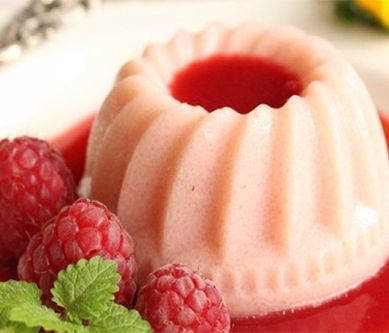 1. Połowę mleka zagotować. W pozostałym wymieszać kaszkę. Gdy mleko zacznie się gotować, wlać kaszkę, zmniejszyć płomień i mieszać kilka minut aż zgęstnieje. Zestawić z ognia, wsypać galaretkę i mieszać do rozpuszczenia. Gorącą masę przelać do wypłukanych zimną wodą silikonowych foremek na babeczki (najlepiej z dziurką). Odstawić do wystudzenia a następnie wstawić do lodówki aby się schłodziły. Sos W międzyczasie rozdrabniamy maliny, podlewamy 1 łyżką wody i podgrzewamy na małym ogniu aż puszczą sok i się rozpadną. Maliny przecieramy przez sitko, dosładzamy do smaku i redukujemy sos. Można odrobinę zagęścić mąką kukurydzianą. Schładzamy. Deserki ostrożnie wykładamy na talerzyki, do środka wlewamy sos malinowy.