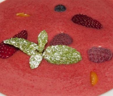 1. Umyte owoce miksujemy. Wodę z cukrem ,cynamonem i goździkami gotujemy ok 10 min. Dolewamy sok malinowy. Odstawiamy do schłodzenia. Po schłodzeniu syrop wlewamy do owoców. Usuwamy goździki.Do zupy wlewamy sok pomarańczowy i cytrynowy. Dodajemy jogurt malinowy i śmietanę. Wkładamy do lodówki na 1 godzinę. Następnie wlewamy zupę na talerz, wrzucamy całe owoce malin, jagód i truskawki, oraz cząstki pomarańczy. Dekorujemy miętą i posypujemy cukrem pudrem.