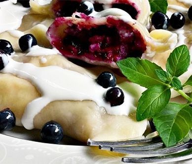 1. Twaróg rozgnieść z cukrem i wymieszać z kaszą manna i jagodami.Do miski wsypac makę, dodać sól, mieszając widelcem wlewać mleko, olej, wodę wymieszaną z jajkiem.Połączyć składniki i wyrobić elastyczne ciasto. Wałkować je, wycinać kółka i układać porcje farszu, zlepiać pierogi i układać na ściereczce. Pierogi gotować w osolonej wodzie kilka minut od wypłyniecia.Wyjmować łyżką cedzakową na talerze, polać smietaną i dodatkowo posypac świeżymi jagodami.