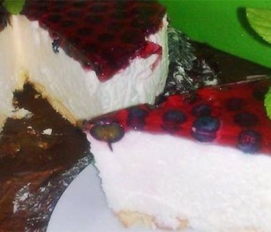 1. Galaretkę rozpuszczamy w 450 ml gorącej wody i zostawiamy do wystudzenia, następnie wkładamy do lodówki, aż zacznie tężeć. Żelatynę zalewamy gorącą wodą, mieszamy i zostawiamy do całkowitego wystudzenia. Serek chwilę miksujemy razem z przesianym cukrem pudrem. Niewielkim strumieniem wlewamy ostudzoną żelatynę, cały czas miksując na średnich obrotach. Kremówkę ubijamy na sztywno i dodajemy do masy serowej miksując na małych obrotach. W tortownicy o śr. 24-26 cm układamy na dnie biszkopty. Wykładamy masę serową i wkładamy do lodówki na ok. 1-2 godziny do stężenia. Po tym czasie na wierzchu układamy borówki i zalewamy tężejąca galaretką. Wkładamy do lodówki na min kilka godzin lub całą noc.