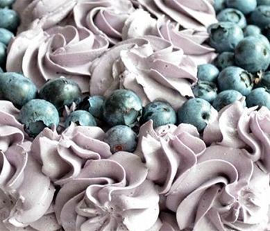 1. Pieczenie blatów Piekarnik nagrzać do temperatury 180 ºC. W misie miksera umieścić masło (koniecznie w temperaturze pokojowej) i cukier. Ucierać przez około 5 minut do uzyskania gładkiej i białawej masy. Dodać pojedynczo żółtka i miksować do połączenia używając średniej mocy miksera. Następnie dodać jajko i miksować do uzyskania gładkiej masy. Wraz z ostatnim jajkiem do masy dodać aromat waniliowy. W osobnym naczyniu wymieszać mąkę z proszkiem do pieczenia i solą. Do naczynia z masą maślaną dodać około 1/3 mąki, dokładnie wymieszać, następnie dodać 1/2 mleka i ponownie wymieszać. Kontynuować do wyczerpania składników. Ciasto rozdzielić na 3 części i piec w tortownicy, uprzednio wyłożonej papierem do pieczenia. Piec przez około 15 minut do lekkiego przyrumienienia. Po wyciągnięciu z piekarnika blaty i studzić na kratce. Krem śmietanowy Śmietanę ubić na sztywno, dodając cukier puder pod koniec ubijania. Krem maślany Białka z szczyptą soli i cukrem umieścić nad kąpielą wodną. Podgrzewać i mieszać do momentu całkowitego rozpuszczenia się cukru. Gdy ziarenka cukru są już niewyczuwalne (najlepiej sprawdzić to palcami), misę zdjąć z kąpieli i ubić białka na bardzo gęstą bezę (ubijać przez około 8 minut). Po tym czasie do bezy dodawać masło kawałek po kawałku i miksować do połączenia (masa zrobi się trochę rzadsza). Po dodaniu całości masła kontynuować ubijanie do momentu uzyskania bardzo gęstego kremu, zachowującego kształty po zaprzestaniu miksowania i potrząśnięciu misą. Na koniec dodać barwnik do uzyskania porządanego koloru. Złożenie tortu Gdy blaty będą już zupełnie zimne, można przystąpić do składania tortu. Jeden z blatów nasączyć ponczem, położyć na wierzch połowę bitej śmietany i posypać połową borówek. Przykryć kolejnym blatem, naponczować, wyłożyć resztę śmietany i borówek, przykryć trzecim blatem, który również należy naponczować. Wierzch i boki ciasta pokryć bardzo cienką warstwą kremu maślanego. Resztę kremu przełożyć do worka cukierniczego z ozdobną kocówką. Trzymając tylkę prostopadle do powierzchni ciasta, wyciskać kleksy z kremu poruszając tylkę okrężnym ruchem. Na koniec posypać borówkami lub ułożyć je w wymyślny sposób.