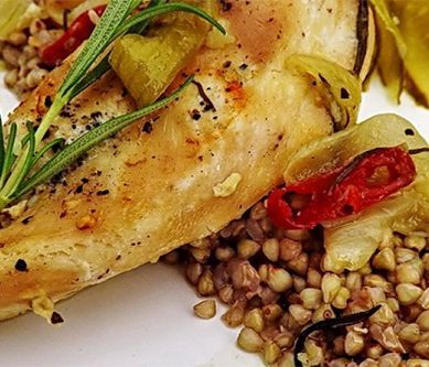 1. Filety z kurczaka myjemy, oczyszczamy i osuszamy. Każdego fileta możemy podzielić dwie części, lub oddzielić tylko polędwiczki. Mięso nacieramy solą, pieprzem czarnym i cytrynowym, przekładamy do żaroodpornej brytfanki . Posypujemy startą skórką z cytryny, polewamy olejem, sokiem z ½ cytryny i obracamy kilka razy mięso do równego rozprowadzenia smaków. Mięso przykrywamy warstwą cebuli pokrojonej w grubsze paski, dodajemy czosnek, chili w plasterkach i igiełki rozmarynu. Wlewamy 100 ml bulionu.Brytfankę przykrywamy pokrywą lub folią aluminiową i wstawiamy do piekarnika. Pieczemy ok. 40 min w temp. 180°C. W połowie pieczenia odwracamy mięso, a cebulę przesuwamy do sosu jaki nam się wytworzył. Filety pieczemy już bez przykrycia do uzyskania złotawego koloru. Co jakiś czas odwracamy mięso, aby równomiernie się przyrumieniło. Kaszę gryczaną gotujemy na sypko w lekko osolonej wodzie. Na talerzu układamy kaszę, którą polewamy sosem powstałym podczas pieczenia z dodatkiem cebuli i papryczki, dodajemy kurczaka i podajemy z ogórkiem kiszonym. Smacznego! Kurczak cytrynowy, znakomicie będzie smakował na ciepło oraz jako dodatek do sałatek.