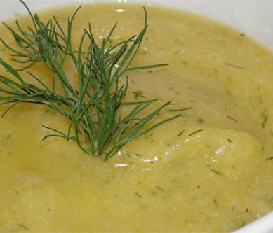 1. Marchew obrać, pokroić w plasterki wrzucić wraz z różyczkami kalafiora go garnka, zalać woda, wsypać 1/4 łyżeczkę soli i szczyptę wegety, gotować do miękkości warzyw. Zupę zblendować, dodać poszatkowany drobno koperek i doprawić do smaku, zagotować.